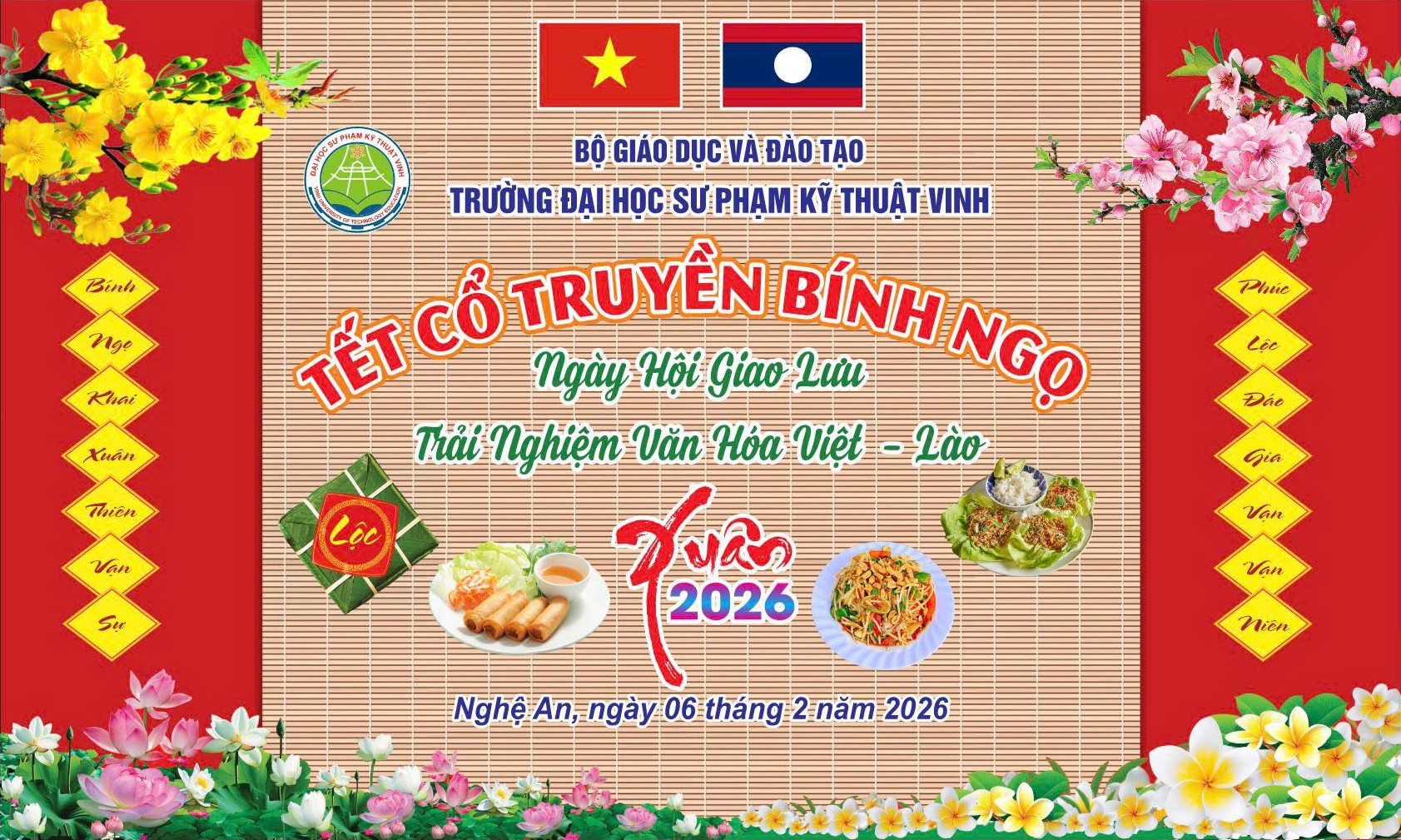 Ngày 06/02/2026, Trường Đại học Sư phạm Kỹ thuật Vinh (VUTED) tổ chức chương trình “Tết cổ truyền Bính Ngọ 2026 – Ngày hội giao lưu, trải nghiệm văn hóa Việt – Lào” dành cho lưu học sinh Lào và sinh viên Việt Nam.